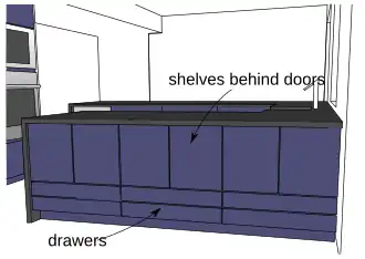 The following drawings will show what I chose to do with my kitchen, in terms of front elements and interior fittings. My favorite interior fittings are definitely drawers. I use drawers and pull-outs for virtually everything: utensils, cups, glass tumblers, plates, bowls, pots, pans, cutting boards, baking sheets, small appliances, and food storage. Close to my cooktop, I even keep a drawer that is high enough to hold my cooking oils, vinegars and other bottled liquids, standing upright. With soft close drawer slides, they won't fall over. Unless there are small children in a household, I wouldn't even advice for pegboard drawer organizers or such; a simple grip shelf liner will probably do perfectly fine and is much cheaper. I don't even use an organizer for my spices; these just lay flat in a shallow drawer, labels up, firmly kept in position by their neighbors and the grip shelf liner on which they all rest.