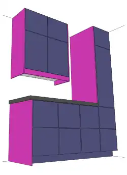 In spite of the relatively large range of available formats, it may happen that for a specific place in your kitchen a fitting cabinet frame cannot be found. Be aware that in many cases it may be possible to convert an available frame to custom dimensions. The only requirements for such modifications are a (hand) circular saw and an idea for the modification of the corresponding front element. I will show an example in a later chapter. Alternatives are to omit that cabinet, to to chose something smaller, or to build a fitting custom element (open shelves: like a wine rack or a place for your cookbooks) from scratch, that is from filler panels.