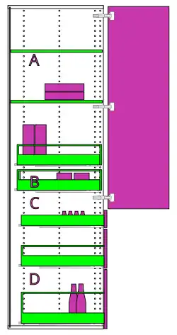 • B. A drawer that is mounted directly under a middle door hinge can be filled as high as you want; the only limit is the element that you install above it.