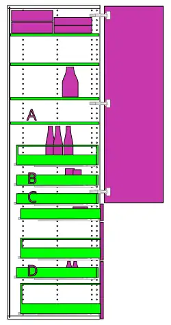 My next configuration comprises three parts: a door with shelves, an array of exterior drawers, and an array of nested drawers.
