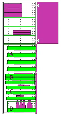 While planning the interior fittings of a cabinet, you need to be aware that door hinges, too, require their share of the available predrilled holes and may prevent the mounting of a shelf or a drawer hinge at a specific position. Depending on its height, a door has 2–4 hinges. Details can be found in the product description. A common position of a hinge midpoint is at ≈2½" (63 mm) below the top and above the bottom edge of a door. Since Ikea use concealed European hinges which latch into precast recesses in the door leaf, it would probably not be advisable to modify a door's hinge pattern.
