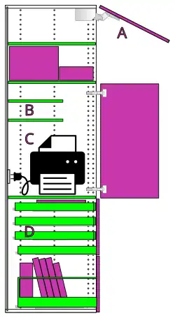 • C. Kitchen cabinets make great accommodations for hulking appliances like for example printers. It may be even possible to install an electric outlet within the cabinet. If the device is very heavy, the shelf on which it rests should be strengthened to increase the load capacity. Check out the Utrusta "reinforced ventilated shelf" which is originally designed to support ovens, but certainly can also help to safely hold other heavy things.