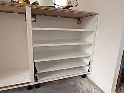 The home improvement store which sold us the product, with the installation work in the price included, delegates the job to local firms. We learned during this process that contractors who install countertops cover a huge range of different ways of working. When we bought our first countertop, in New York State, a decade ago, we had someone coming to our place and pulling a laser-operated gimmick out of a case. He finished the measuring within a few minutes, obviously creating a set of digital data which the would probably feed directly into their stone cutting device. Well, now, in California, we saw exactly the other end of the spectrum: the contractor didn't use laser technology or even a tape measure, but simply created a huge template, glued together from wooden strips. What can I say? Both methods worked out. More or less.