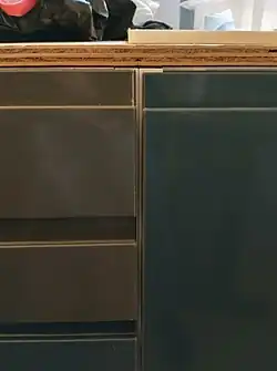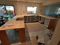 The two edges which would get a waterfall had to be covered with plywood, too. However, at the edge of the bar peninsula we were planning a wrap-around (= countertop material both on the edge's outside and the inside) and therefore omitted the plywood where the wrap-around would go.