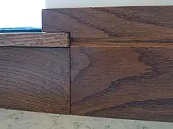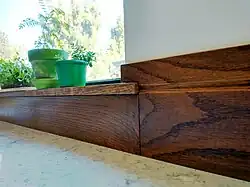 The little horizontal groove that you see in the images matches the design of the (white) custom baseboards which we have installed in our entire home.
