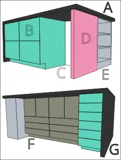 Although there is a wide selection of prefab islands on the market, most kitchen islands and peninsulas are custom built out of the same elements that also constitute a regular cabinet row. Some of the most common elements are (see image):
