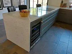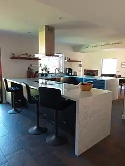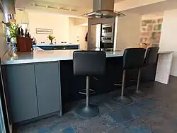 Originally, we had planned to use the northernmost section of the kitchen as a breakfast place. But during the lengthy process of planning and of construction, we dismissed this idea, because in my family, which is a family of individualists, we don't really have a routine of coming together for breakfast at one table, and I was not too keen to establish one either. And there is also the regular dining area just at the other end of the kitchen. But since we had this beautiful and conveniently located space available, I wanted to make it appealing for use. So I declared it our "coffee nook" and furnished it with two comfortable accent chairs and an interesting little table. Now we can read there and have a cup of coffee and chat about or next project…