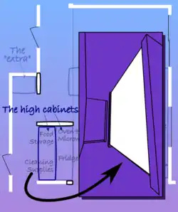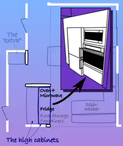 The simplest element in my layout is the narrow extra cabinet at the left side of the image. This is a high cabinet for food storage. I placed it there because…