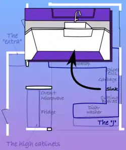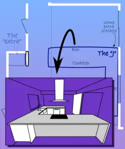 • a U- or rather J-shaped ensemble of base cabinets and appliances