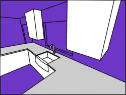 • it gives the tunnel-like passage way (green arrow in the image above) more pleasant proportions, by making it shorter