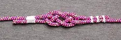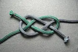 ![]() ![]() Use: The Carrick bend is used for joining two lines. It is particularly appropriate for very heavy rope or cable that is too large and stiff to easily be formed into other common bends. It will not jam even after carrying a significant load or being soaked with water. The Carrick bend's aesthetically pleasing interwoven and symmetrical shape has also made it popular for decorative purposes.