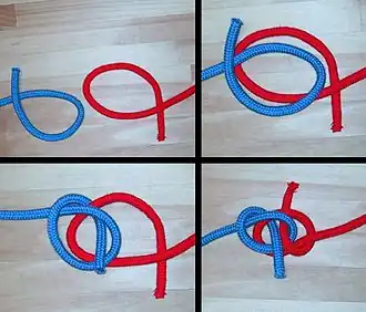 - Pull either loose end once around the loop in the other rope, and then through the "tunnel" created by the two hitches