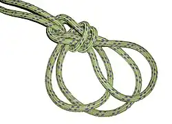 The triple bowline can be used to make an improvised rope chair. The legs go in two loops and the torso goes in the third. To tie it, tie a bowline with a bight.