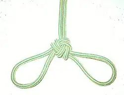 One knot that might come in handy is the triple crown knot. It forms two fixed loops and can be tied without access to the ends of the rope, like the Knots/Loop knots/Bowline on a bight.