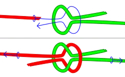 The Thief knot resembles the reef knot except that the free, or working, ends are on opposite sides. It is said that sailors would secure their belongings in a ditty bag using the thief knot, often with the ends hidden. If another sailor went through the bag, the odds were high the thief would tie the bag back using the more common reef knot, revealing the tampering, hence the name. It is difficult to tie by mistake, unlike the granny knot. The thief knot is much less secure than the already insecure reef knot. It unties itself if the lines are pulled when the same action would seize a reef knot. This property was exploited to teach newbies how to tie their hammocks. The bumps in the night when the knots spilled were an unfailing source of hilarity.