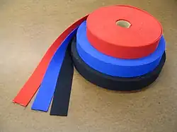 The most popular knots in webbing are the water knot and the grapevine knot. The latter is stronger, but uses more webbing for the knot. It is customary to leave a couple inches extending from the knot, and in many cases climbers tape the ends down onto the main loops. Webbing is also less expensive than rope of similar size particularly kernmantle rope which requires elaborate and expensive manufacturing. Unlike rope, which has manufacturers seeking brand identification and customer loyalty, webbing manufacture is typically generic. Climbing shops sell it off of a spool on a per yard or per foot basis. It is cut with a hot wire as is nylon rope, which prevents fraying and unravelling. However, when webbing does fray and unravel, the result is less disastrous than with rope, which is another albeit minimal advantage. Webbing suffers the drawback of less elasticity than perlon rope, and it may be more difficult to handle with gloves or mittens on. [1][2][3]