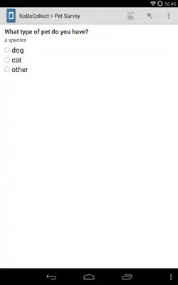 The purpose of this Wikibook is to provide an introduction to the mobile survey software suite called KoBo Toolbox (http://www.kobotoolbox.org/). Using the KoBo Toolbox, surveys for mobile Android devices, such as smartphones and tablets, can be created. The screenshot of the Android application shows a typical multiple-choice (single-select) question.