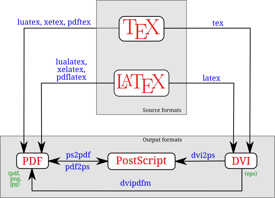The boxed red text represents the file formats, the blue text on the arrows represents the commands you have to use, the small dark green text under the boxes represents the image formats that are supported. Any time you pass through an arrow you lose some information, which might decrease the features of your document. Therefore, you should choose the shortest route to reach your target format. This is probably the most convenient way to obtain an output in your desired format anyway. Starting from a LaTeX source, the best way is to use only latex for a DVI output, or only pdflatex for a PDF output, converting to PostScript only when it is necessary to print the document.