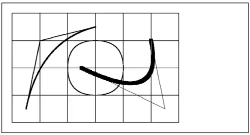 The control points of the two Bézier curves were calculated with formulas (*). The positive branch is determined by , and , . Again, the picture is defined in mathematically convenient coordinates, and the lower left corner is assigned the mathematical coordinates (−3,−2) (black disk).