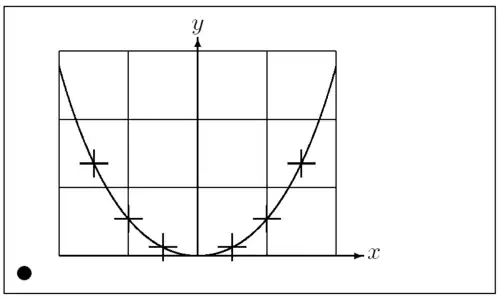 In this figure, each symmetric half of the catenary is approximated by a quadratic Bézier curve. The right half of the curve ends in the point (2, 2.7622), the slope there having the value m = 3.6269. Using again equation (*), we can calculate the intermediate control points. They turn out to be (1.2384, 0) and (−1.2384, 0). The crosses indicate points of the real catenary. The error is barely noticeable, being less than one percent. This example points out the use of the optional argument of the \begin{picture} command. The picture is defined in a convenient "mathematical" coordinates, whereas by the command