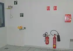 These pieces of equipment should be clearly marked with signs and pictures, and are often marked on evacuation maps.