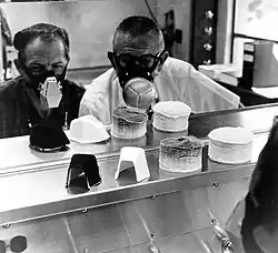 Lab workers may be required to wear specific respiratory protection to safely work with hazardous materials. In this image, researchers are shown working with uranium. Avoiding inhalation of radioactive particles is an important consideration here.