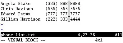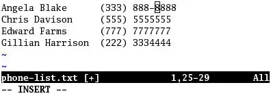 block-visual is started by pressing <Ctrl-V> (or <Ctrl-Q> in some windows versions. If neither of these works use ":help visual-block" to find out how). Visual blocks always maintain a rectangular selection, highlighting only specific columns of characters over multiple lines. In this following example the user wants to put a dash in each phone number between the second and third number fields: