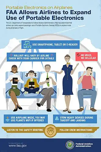 - ↑ Greco, Kristie. (October 2013). "Press Release – FAA to Allow Airlines to Expand Use of Personal Electronics". Retrieved from https://www.faa.gov/news/press_releases/news_story.cfm?newsId=15254