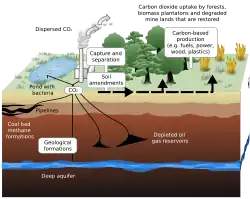 Clean coal refers to practices that reduce environmental burdens of the coal industry by sequestering power plant emissions. Clean coal technologies include controls to directly capture sulfur and nitrous oxide and other greenhouse gas emissions emissions in plants;[1] coal gasification processes that allow for more efficient carbon dioxide (CO2) removal prior to combustion; and geologic carbon sequestration, in which this captured carbon is injected deep underground in saline aquifers. Carbon capture and storage (CCS) integrates the capture of CO2 from emissions with GCS technologies and has attracted considerable interest in recent years as a key tool for climate change mitigation.[2]