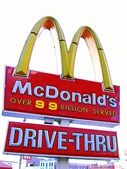 A more relatable explanation on how extremist groups are able to convince people to join their groups is known as the Bandwagon Effect. The Bandwagon Effect occurs when consumers follow the behaviors of others.[10] The need to fit in is a common explanation of why this effect occurs. This effect is seen commonly in the marketing world. Restaurant chains, such as McDonald's, employ this effect on the their signs or through commercials. McDonald's uses "Over 99 Billion Served" on their sign (Figure 2). This statement demonstrates the Bandwagon Effect in marketing.