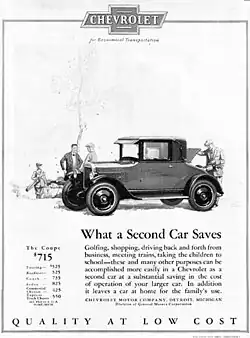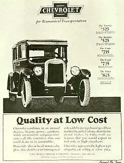 The CEO of General Motors (GM) in the mid-1920s, Alfred P. Sloan, witnessed Ford's inertia, which gave him the idea of releasing new models, new colors, and faster engines every year, subsequently fabricating demand. Sloan states in his autobiography, My Years With General Motors, "The changes in the new model should be so novel and attractive as to create demand...and a certain amount of dissatisfaction with past models as compared with the new one".[6] This can be witnessed in advertisements released between 1925 and 1927 from Chevrolet, a sector of GM. In each of the advertisements, the vehicle has the same relative appearance with no major changes, but in different colors. Each advertisement appeals to a wise customer base using words and images. Words and phrases such as "Quality at Low Cost" [image 1] were featured in many 1925 Chevrolet advertisements. Advertisements from 1926 and 1927 continued its slogan of "Quality at Low Cost", while depicting women and pushing Chevrolets as a family car.