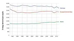 In 2012, Germany was the eighth largest consumer of energy in the world, and the largest in Europe.[2] Germany has consistently remained atop the world and Eurasian averages in energy consumption over the last 20 years (fig. 2). Germany still ranks fourth in coal and eighth in petroleum worldwide, despite decreased demand of those two resources by 35.7% and 15.6% respectively since 1991.[2] Germany depends on coal, nuclear, and petroleum for its energy needs.