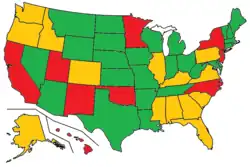 Red states in the map shown have substantial legislation in place, meaning vaping is banned along with smoking in most public places. California, Utah, New York and Hawaii ban vaporizers where traditional smoking is prohibited including bars, restaurants, offices, parks and beaches. In New Mexico and Minnesota, there are heavy taxes in place on vaping products. MInnesota doesn’t currently ban vaping in all public areas, but does have bans in place for hospitals, government buildings, and all college campuses, and it also requires child-resistant packaging for all e liquids sold as well as taxing vaping products as tobacco products. Yellow states have moderate legislation. These states ban the sale of vaporizer products to minors and have some cities that ban their use in public areas. Many of these states also have bans in place for college campuses. Green states have very limited legislation. Many of these states have no restrictions whatsoever on the sale or use of vaporizers, and some have only small restrictions such as sale to minors. [14]