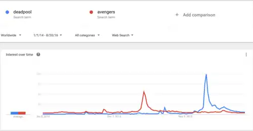 This advertising campaign was highly successful. The campaign started in late December 2015 for the February release date. Shortly following this, the term Deadpool greatly increased in search volume. In comparison to the Avengers, another superhero movie released during a similar timeframe, Deadpool received a spike of nearly double the search volume (Figure 1).