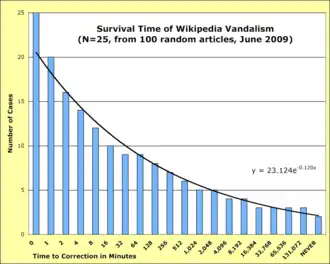 "Vandalism" is very prominent in Wikipedia, as it is an open-access encyclopedia. In a study published on vandalism survival, 25 out of 100 random articles were vandalized. The Counter-Vandalism Unit and automated bots have been created to counteract "vandalism."