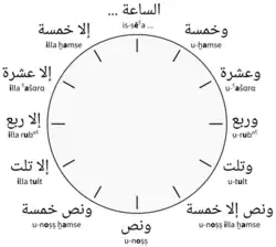 | الساعة تلاتة إلا تلت is-sēʕa talāte/tlāte 'illa tult/tilt | الساعة تنتين وأربعين دقيقة is-sēʕa tintēn w-'arbaʕīn da'ī'a | 2:40 |