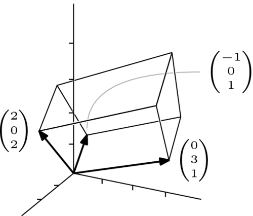 Volume, because it is an absolute value, does not depend on the order in which the vectors are given. The volume of the parallelepiped in Example 1.1, can also be computed as the absolute value of this determinant.
