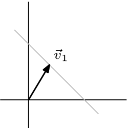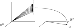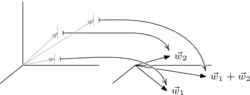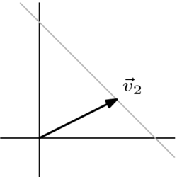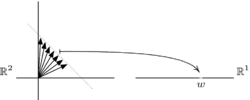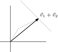 Again in this drawing, the vectors that map to lie in the domain in a vertical line (only one such vector is shown, in gray). Call any such member of this inverse image a " vector". Similarly, there is a vertical line of " vectors" and a vertical line of " vectors". Now, has the property that if and then . This says that the vector classes add, in the sense that any vector plus any vector equals a vector, (A similar statement holds about the classes under scalar multiplication.)