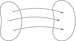 However, omitting the "one-to-one" condition does make a difference. A homomorphism may have many elements of the domain that map to one element of the codomain. Below is a "bean " sketch of a many-to-one map between sets.[1] It shows three elements of the codomain that are each the image of many members of the domain.