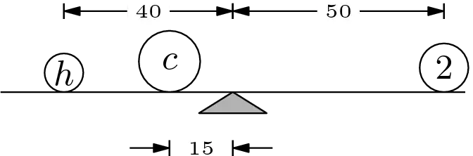 The first example is from Physics. Suppose that we are given three objects, one with a mass known to be 2 kg, and are asked to find the unknown masses. Suppose further that experimentation with a meter stick produces two balances (one of which is depicted below).