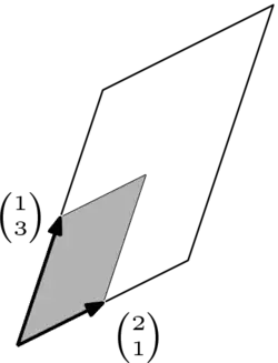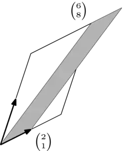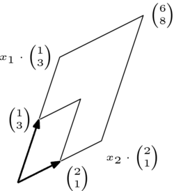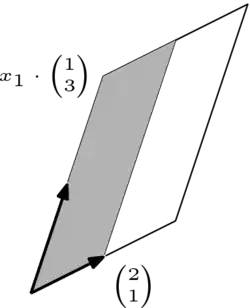 So even without determinants we can state the algebraic issue that opened this book, finding the solution of a linear system, in geometric terms: by what factors and must we dilate the vectors to expand the small parallegram to fill the larger one?