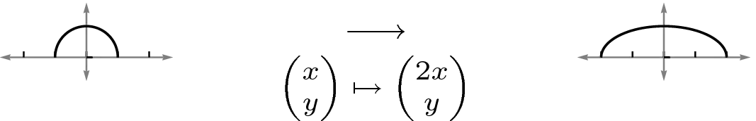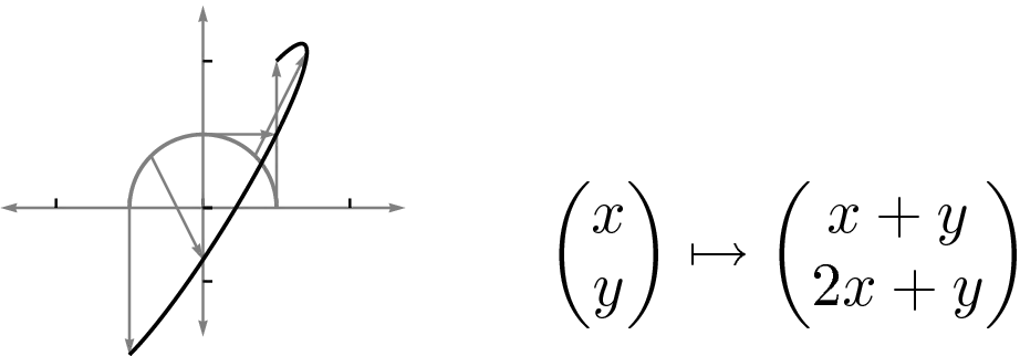 The characterization of linear transformations in terms of the elementary operations is nice in some ways (for instance, we can easily see that lines are mapped to lines because each of the operations of projection, dilation, reflection, and skew maps lines to lines), but when a map is expressed as a composition of many small operations---no matter how simple---the description is less than ideal. We finish with another way, a somewhat more holistic way, of picturing the geometric effect of transformations of .