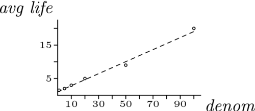 For example, the different denominations of U.S. money have different average times in circulation (the $2 bill is left off as a special case). How long should we expect a $25 bill to last?