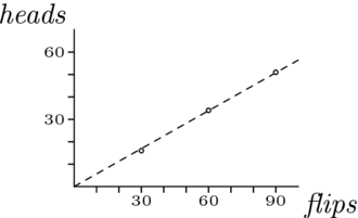 For instance, suppose that we have a coin to use in flipping. This coin has some proportion of heads to total flips, determined by how it is physically constructed, and we want to know if is near . We can get experimental data by flipping it many times. This is the result a penny experiment, including some intermediate numbers.