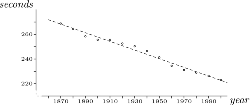 We close by considering the times for the men's mile race (Oakley & Baker 1977). These are the world records that were in force on January first of the given years. We want to project when a 3:40 mile will be run.