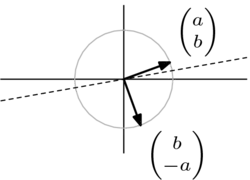 We can use this insight to delimit the geometric actions possible in distance-preserving maps. Because , any is mapped by to lie somewhere on the circle about the origin that has radius equal to the length of . In particular, and are mapped to the unit circle. What's more, once we fix the unit vector as mapped to the vector with components and then there are only two places where can be mapped if that image is to be perpendicular to the first vector: one where maintains its position a quarter circle clockwise from
