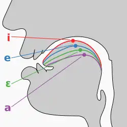 Tongue positions of cardinal front vowels with highest point indicated. The position of the highest point is used to determine vowel height and backness