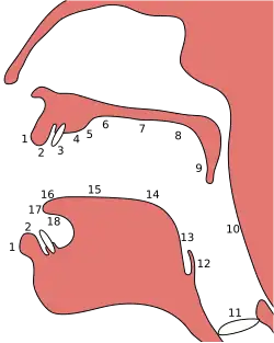 • Dental consonants have the tongue making contact with the upper teeth (area 3 in the diagram). An example from English is the [θ] sound in the word thin.