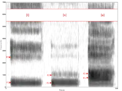 Spectrogram of American English vowels [i, u, ɑ] showing the formants f1 and f2