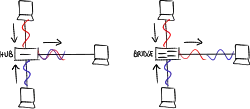 - ↑ The difference between repeaters and hubs lies in the number of ports: repeater has two ports, hub has more than two ports.
